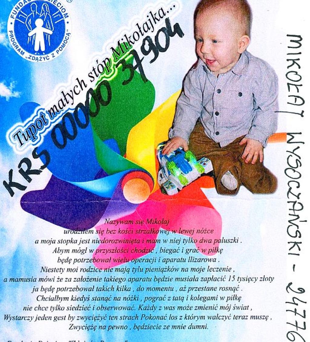 Wszelką pomoc materialną można przesyłać na konto fundacji dzieciom "Zdążyć z Pomocą" w banki BPH SA na rachunek numer 6110 6000 7600 0033 1000 1826 60 a w tytule wpłaty należy wpisać "24776 - Wysoczański Mikołaj - darowizna na pomoc i ochronę zdrowia".